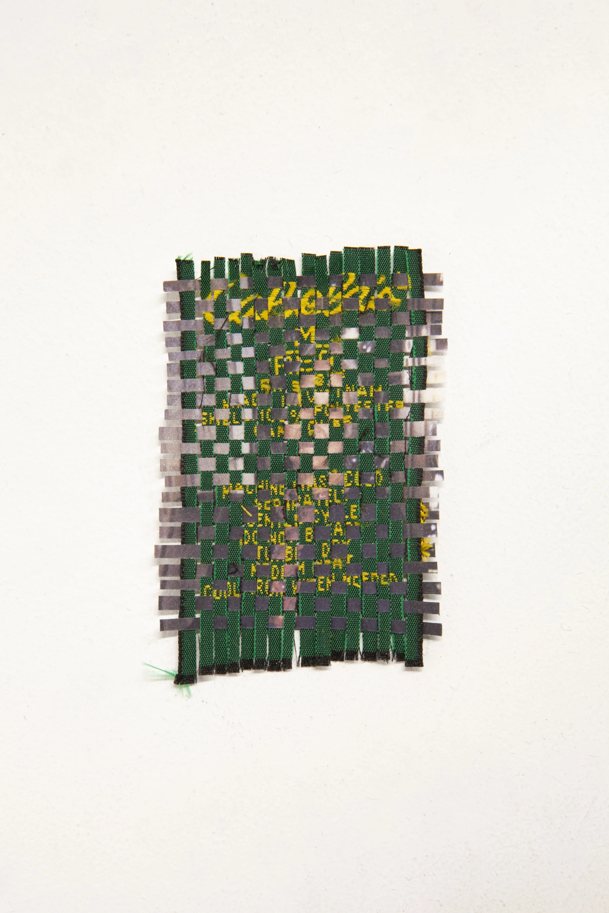 This project consists of miniature hand weavings made from my garments’ care labels and photographs of my great-grandmother. As these slivers weave over and under one another, Care Labels exposes the complementary and contradictory relationship between care and identity. While labels such as “Chinese” and “woman” can help us learn how to care for someone, they also serve as forms of erasure, obscuring the totality of that person’s multifaceted and evolving needs. Read in the other direction, however, this work suggests that truly seeing someone–working hard to make out their image–can render the labels irrelevant, creating alternate routes towards care and knowing.